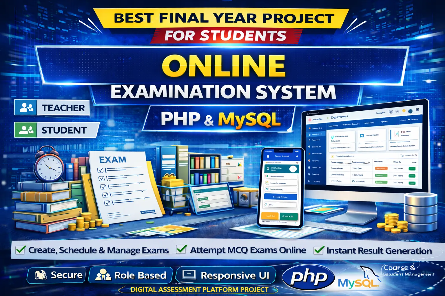 Built with HTML, CSS, JavaScript, PHP, and MySQL, the project offers a responsive user interface combined with a robust backend for secure data management. It automates key processes such as exam scheduling, answer evaluation, and result generation, ensuring accuracy, transparency, and efficiency in academic assessments.