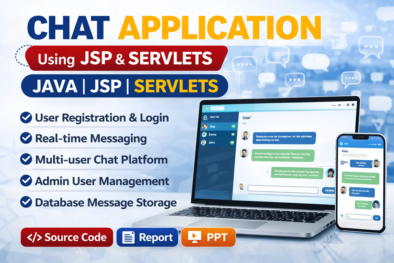 The Chat Application Using Java is a web-based communication system developed using Java JSP, Servlets, MySQL, HTML, CSS, and JavaScript. The project allows users to communicate with each other through an online chat interface where messages can be exchanged in real time through a web browser.
